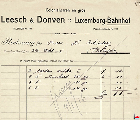 | 1915 | ![]() Colonialwaren en gros Leesch & Donven, Luxemburg-Bahnhof, tél: 894 - Rechnung vom 22.10.1915 an Fr. Théodory, Pétange (Collection industrie.lu) Milka, Suchard |