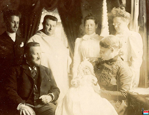 Juillet 1900 - Baptême d'Alfred de Muyser, né le 27.7.1900 à Saint-Pétersbourg. - Assis à gauche, M. Albert Lefebvre, grand-oncle d'Alfred. (Collection famille Aschman-Bodson)