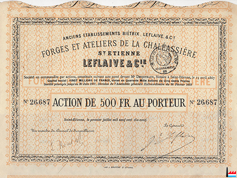 | 1.7.1919 | Action des Anciens Etablissements Biétrix - Leflaive & Cie - Forges et Ateliers de la Chaléassière - Leflaive & Cie, Saint-Etienne (Loire |