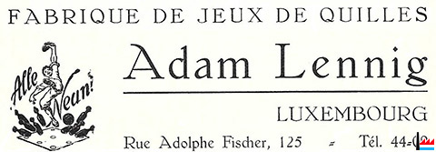 | 1947/48 | Fabrique de jeux de quilles Adam Lennig 125, rue Adolphe Fischer, Luxembourg |