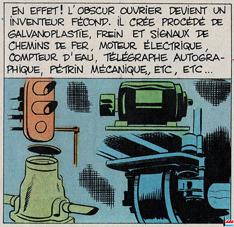![]() Etienne Lenoir, invente un procédé de galvanoplastie (racheté par Christofle), frein, signaux de chemin de fer, moteur électrique, compteur d'eau, télégraphe autographique, pétrin mécanique (mechanischer Kneter), etc. (Spirou N° 1657 de 1970; Collection: industrie.lu) |