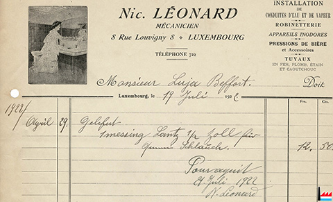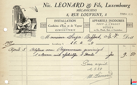 | <=1928 | ![]() LÉONARD Nic. & fils, mécaniciens, Luxembourg, 8 rue Louvigny, tél: 2722 (Collection industrie.lu) Installation de conduites d'eau et de vapeur - robinetterie - appareils inodores - tout à l'égout - tuyaux en fer, plomb, étain et caoutchouc ![]() Salle de bains - <=1928 (Collection industrie.lu) |