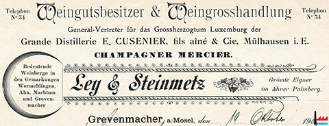 | <=1909 | ![]() Ley & Steinmetz, Grevenmacher, Weingutsbesitzer & Weingrosshandlung, tél: 34 Bedeutende Weinberge in den Gemarkungen Wormeldingen, Ahn, Machtum und Grevenmacher General-Vertreter für das Grossherzogtum Luxemburg der Grande Distillerie E. Cusenier, fils aîné & Cie, Mülhausen in Elsass Champagne Mercier |