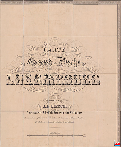| 1862 | ![]() Carte du Grand-Duché de Luxembourg, dressée par Jean-Baptiste Liesch, vérificateur Chef de bureau du Cadastre de concert avec plusieurs collaborateurs de la même administration - échelle 1:40.000 https://query.an.etat.lu/Query/detail.aspx?ID=202178 |