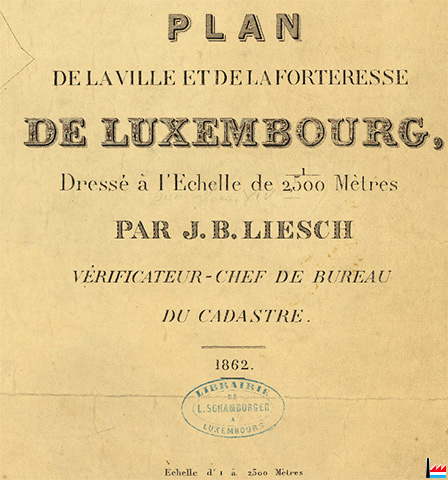 | 1862 | ![]() Plan de la Ville et de la Forteresse de Luxembourg, dressé par J.B. Liesch, vérificateur-chef de bureau du Cadastre - 1862 (Librairie de L. Schamburger, Luxembourg) |