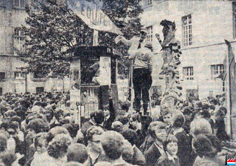 | 1963 | ![]() Bichermârt vum Millénaire - Luxemburg-Stadt (LW: 17.9.1963) Millénaire-Überbleibsel zierten also gestern im alten Athenäumshof den „Bichermärt“, der nach der Heiliggeist-Messe bis gegen Mittag sein emsiges, lautes und vorlautes Treiben entfaltete. Feilgeboten wurden zu Schleuderpreisen (?) Kataloge unserer Millenniumsausstellung: „E Buch, dät jidder Letzeburger lie’se muss!“ Anderswo zeigten zwei humorvolle Darstellungen, links den „Prof du Millénaire“, rechts den „Magister 963“, in der Hand den Codex Aureus. „Ons Equipe” war in Hochformat angetreten, sie besaß den „höchsten“ Bücherstand, eine Litfaßsäule, mit bunten Plakaten vollgeklebt. Obenauf eine Einladung zum Bergengruen-Leseabend am kommenden 14. Oktober ... (Bitte nicht verpassen!) |