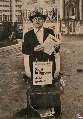 | 9.1979 | ![]() Pol Aschman, als Zeitungsverkäufer, vor Litfaßsäule, Luxemburg-Bahnhof (LW: 14.9.1979 - Photo: Ralf Nimax) Op der Litfasssail eng Publicité: Fête du Raisin et du Vin, Grevenmacher |