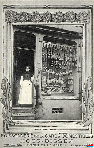 | 45 | 11 | ![]() Poissonnerie de la Gare - Comestibles - Hoss-Bissen, Luxemburg, 11 avenue de la Gare, tél: 920 (Carte postale: P. Kutter, Luxembourg) (elo: 45 avenue de la Gare, = fréier: 11? avenue de la Gare) |