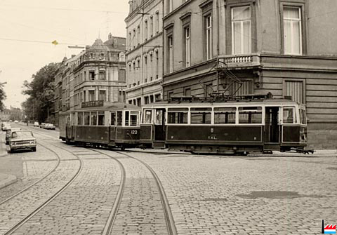 ![]() Motrice TVL No 11 avec 2 remorques 120 + ? à la rue des Bains (Photo collection: René Birgen) |