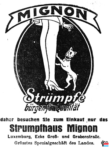 | 1932 | ![]() Chapellerie Mersch-Berweiler fils - L. Perlia - Strumpfhaus Mignon (Photo: 1902 Batty Fischer) |