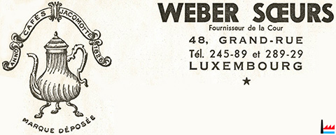 | <=1961 | ![]() Weber Soeurs, Luxembourg (Collection: industrie.lu) 48 Grand'rue Tél: 24589 / 28929 Cafés Jacqmotte Dessert, Mélange Royal, Moka, Extra, N° 1, N° 2, N° 3, Maragogype, Caracoli, R.T., R. Camée - le bijou des cafés |