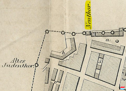 | 1850 | ![]() Luxemburg - 1850 - Plan von Luxemburg mit Einzeichnung der drei ursprünglichen Enceinten von 963, 1050 & 1393 aber mit Weglassung aller jetzigen Festungswerke. Gezeichnet von Friedr. Wilh. Engelhardt, 1850 (Collection Philippe Aschman) a: Neutor-Kaserne b: Zeughaus = Arsenal c: Juden-Kaserne (= Aldringen-Kaserne) - 5: Zollamts-Gebäude Altes Judentor / Altes Judenthor Neutor / Neuthor - Porte Neuve |