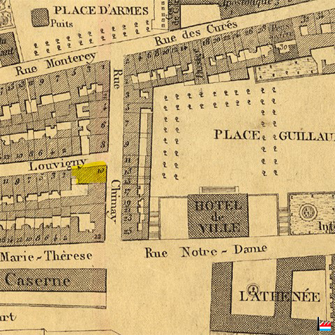 Luxembourg, coin - 10 rue Chimay - rue Louvigny (Plan de la Ville et de la Forteresse de Luxembourg, dressé par J.B. Liesch, vérificateur-chef de bureau du Cadastre - 1862)