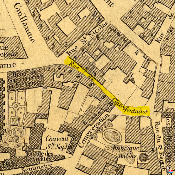 Luxembourg - rue Clairefontaine - rue de la Congrégation - rue du St. Esprit - rue Guillaume (Plan de la Ville et de la Forteresse de Luxembourg, dressé par J.B. Liesch, vérificateur-chef de bureau du Cadastre - 1862)
