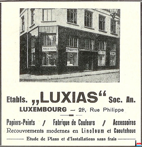 | <=1935 | ![]() Etablissements LUXIAS S.A. - Fabrique de couleurs, 28 rue Philippe, Luxembourg - 1935 (Collection Charles-Louis Aschman) |