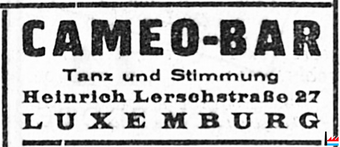 | <=1941 | ![]() CAMEO-BAR, Tanz und Stimmung, Heinrich Lerschstraße 27, Luxemburg (LW: 18.1.1941) |