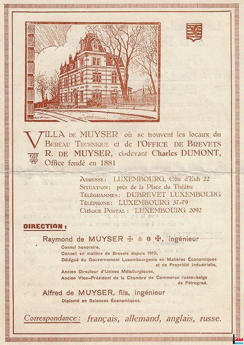 ![]() VILLA de MUYSER où se trouvent les locaux du Bureau technique et de l’Office de brevets R. de MUYSER, ci-devant Charles DUMONT, office fondé en 1881. Adresse : Luxembourg, Côte d’Eich 22 Situation : près de la Place du Théâtre Téléphone : 37-39 Direction : Alfred de Muyser, fils, ingénieur (Publicité, 18,4 x 13,6 cm. - Collection de Muyser-Huck) |