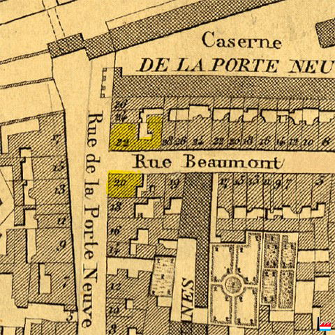 Luxembourg - coins rue de la Porte Neuve - rue Beaumont (Plan de la Ville et de la Forteresse de Luxembourg, dressé par J.B. Liesch, vérificateur-chef de bureau du Cadastre - 1862)