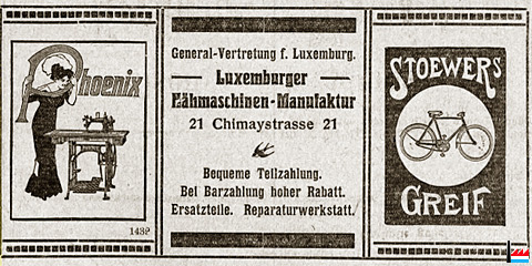 | 1911 | Luxemburger Nähmaschinen-Manufaktur, Luxemburg Vertrieb von Nähmaschinen und Fahrrädern Gesellschafter: 1° Elisabeth Wilké, zu Luxemburg; 2° Frau Karl Schaafs, geborene Helene Wolter, zu Wanne (Westphalen) ; 3° Frau Karl Schwall, geborene Frieda Rockstuhl, zu Hollerich Geschäftsführer: Karl Schwall zu Hollerich. Gesellschaft unter Gesamtnamen; ein jeder der Gesellschafter sowie der zum Geschäftsführer bezeichnete Karl Schwall haben das Recht, die Firma zu führen und zu zeichnen; die Firma wird gezeichnet mit dem Stempel der Gesellschaft gefolgt von der Unterschrift eines der Gesellschafter oder des Geschäftsführers. (Inscription au registre aux firmes N° 227 - Du 10 novembre 1911) |