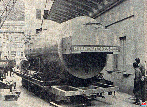 Dieser Großwasserraumkessel, besonders geeignet zur Dampferzeugung unter schwankender Belastung, soll in Kürze die beiden kohlenbeheizten M.A.N.-Kessel aus dem Jahr 1937 ersetzen. Der durch die spezialisierten Firmen Schiltz-Feinen und Intersped abgeladene Kessel, mit einem Leergewicht von rund 20 t und den Abmessungen 6,17 x 2,75 x 3,20 m, hat eine Heizfläche von 160 m2 und ist zur Erzeugung einer stündlichen Sattdampfmenge von 7 t bestimmt. (LW: 14.5.1971) |