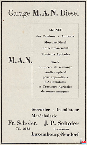 | <=1949 | ![]() Fr. Scholer, J.P. Scholer successeur, Luxembourg-Neudorf - 1949 (Collection: industrie.lu) Garage M.A.N. Diesel |