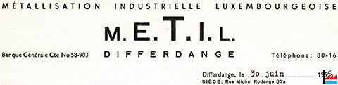 | <=1956 | ![]() METIL - METALLISATION INDUSTRIELLE LUXEMBOURGEOIS (Collection: industrie.lu) Siège: 37a rue Michel Rodange, Differdange |