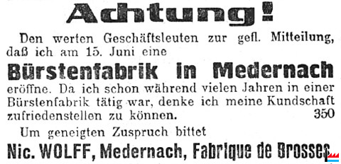 ![]() Fabrique de brosses Nicolas Wolff, Medernach (LW: 12.6.1937) |