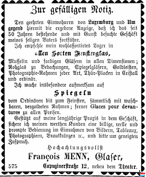 | <=1873 | * Menn Godfroid, Glaser, Capuzinerstr. 12 (In: Luxemburger Wegweiser, Schintgen B., pens. Lehrer, Luxemburg - Druck von Fr. Beffort, Luxemburg, 1873) |