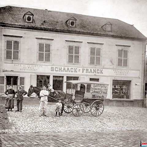 | 1911 | ![]() Café de la Justice de la Paix - Restaurant Schaack-Franck Boulangerie - Pâtisserie - Laiterie (Archives: Nico Lucas) Schaack - Franck ![]() Boulangerie Schaack - Franck, Mersch (Archives: Nico Lucas) farines, mais et sons Mehl, Mais und Kleie |