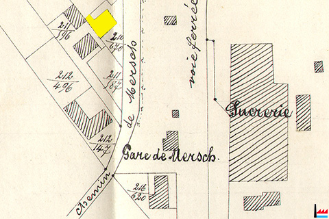 | 1874 | ![]() Hôtel Brandenburger - Maison 15 rue de la Gare, Mersch - Maison 17 rue de la Gare, Mersch - Gare de Mersch - Hôtel Buvette de la Gare - voie ferrée dite Ligne du Nord de Luxembourg à Spa - Sucrerie - 1874 (Document: H810 ANLux) |