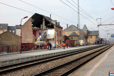 ![]() ![]() Démolition de la maison 20 rue de la Gare, Mersch - vue du Quai de la Gare de Mersch (Photo: 4.3.2004 Nico Lucas) |