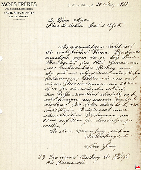 | 7.5.1918 | Fondation - Gründung : Moes Wilhelm, Esch/Alzette, Schreinereiunternehmer und Holzschuhfabrikant |