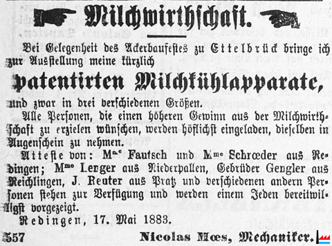 | 1883 | Prämien der beiden Ackerbaugesellschaften bei der allgemeinen Viehausstellung in Ettelbrück: Vergoldete Medaille für Milchwirtschafts-Geräte Herr Moes von Redingen |