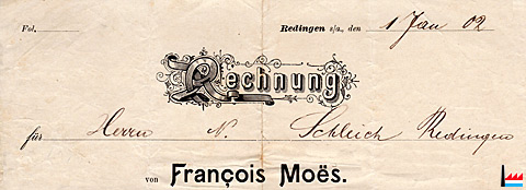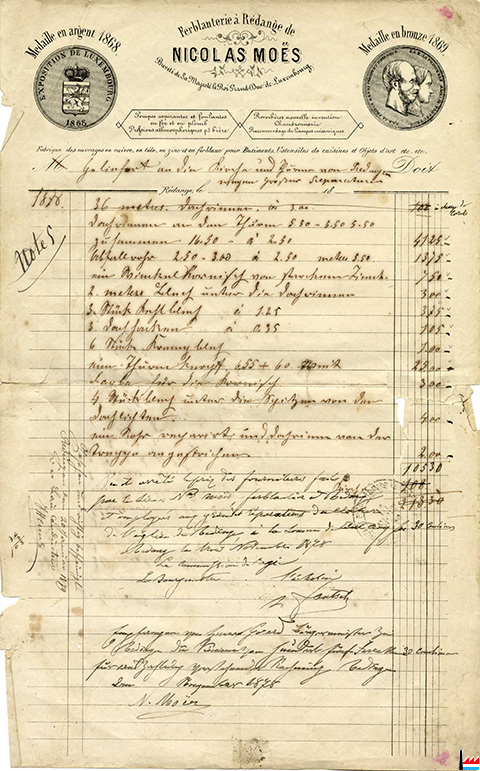 | <1878 | Ferblanterie Nicolas Moës, à Rédange Breveté de Sa Majesté le Roi Grand-Duc de Luxembourg Pompes aspirantes et foulantes en fer et en plomb Fabrique des ouvrages en cuivre, en tôle, en zinc et en fer blanc pour bâtiments, ustensiles de cuisines et objets d'art, etc. |