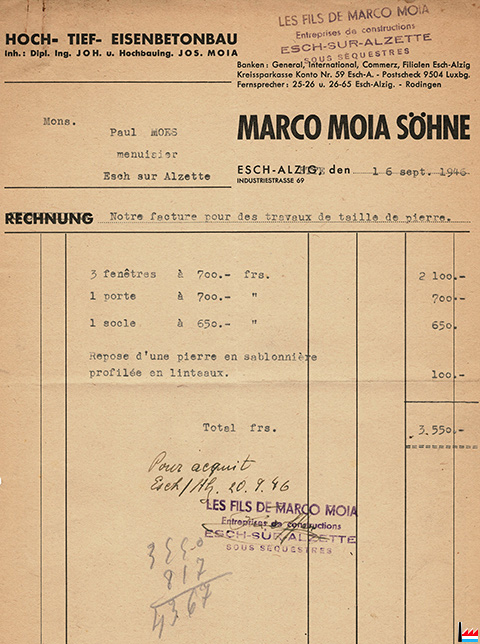 | <=1942 | Moia Marco fils, 69 rue de l'Industrie, Esch/Alzette, tél: 2526, 2665 Jean Moia, Dipl.-Ing. + Jos. Moia, Hochbau-Ing. |
