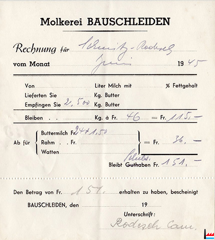 ![]() Molkerei Bauschleiden (Bauschelt, Boulaide) - Rechnung vom Juni 1945 - Rodesch Camille (Collection: industrie.lu) |