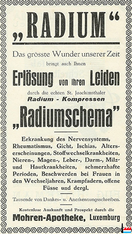 ![]() 1931 - Mohren-Apotheke, Luxemburg - “RADIUM” Das grösste Wunder unserer Zeit und “Radiumschema”. In: Volksvereinshefte - 3. Serie: Technik - Die Elektrizität in der Landwirtschaft und im Haushalt von Johann Birnbaum, Werkstättenvorsteher der staatlichen Handwerkerschule, Verlag des Luxemburger katholischen Volksvereins, 1931, 80 S. (Collection Charles-Louis Aschman) |