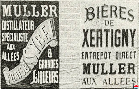 | 1905 | On lit dans un journal de Vésoul : Nous relevons les distinctions dont vient d’être honoré ces temps derniers notre concitoyen M. Muller, distillateur à Vésoul pour sa liqueur «Fraise Sybel» : Exposition Internationale de Liège. - Médaille d'Or. Exposition Internationale des Arts et Métiers de Bruxelles. - Grand Prix. A propos de cette dernière exposition, nous notons le passage suivant la Chronique de Bruxelles du 5 octobre 1905, relatant la visite du roi Léopold II à l’Exposition des Arts et Métiers: Le Souverain reçoit, sur sa demande, des explications sur un nouveau produit, la suave liqueur "Fraise Sybel" qui a obtenu la Médaille d’Or à l’Exposition de Liége. Sa Majesté s’en déclare enchantée. Nos félicitations d’autant plus vives que nous devons à M. Muller la création à Vésoul d’une industrie intéressante pour la prospérité de la ville. (M. Muller est l’ancien directeur de la maison Cointreau à Luxembourg, où il n’a laissé que d’excellents souvenirs) (LIL: 19.12.1905) |