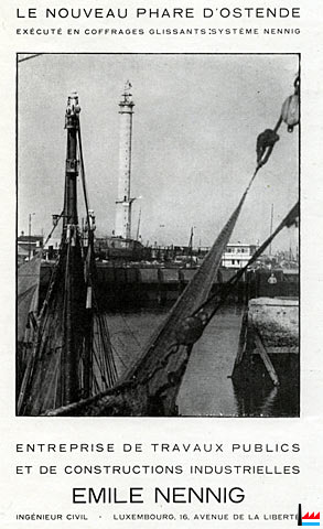 | <=1948 | ![]() Le nouveau phare d'Ostende (hauteur: 65 mètres, exécuté en coffrages glissants système Nennig Entreprise de travaux publics et de constructions industrielles Emile Nennig - Luxembourg - 1948 |
