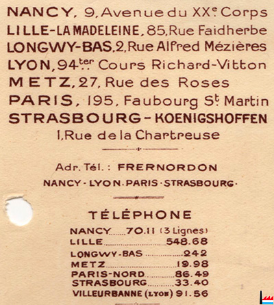 | <=1939 | Etablissements Nordon Frères Nancy, 9 avenue du XXe Corps Lille - La Madeleine, 85 rue Faidherbe Longwy-Bas, 2 rue Alfred Mézières Lyon, 94ter Cours Richard Vitton Metz, 27 rue des Roses Paris, 195 Faubourg St Martin Strasbourg-Koenigshoffen, 1 rue de la Chartreuse |