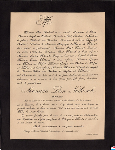 | 2.11.1895 | ![]() Faire-part du décès de Nothomb Léon, ingénieur, * 8.2.1858 Pétange; + 2.11.1895 Pétange (Collection: industrie.lu) |