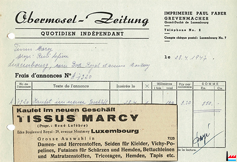 ![]() Obermosel-Zeitung - Imprimerie Paul Faber, Grevenmacher - Frais d'annonce fir eng Annonce an der Obermosel-Zeitung den 28.4.1947 fir Tissus Marcy, Luxembourg, coin Boulevard Royal - 29 avenue Monterey (Collection: industrie.lu) |