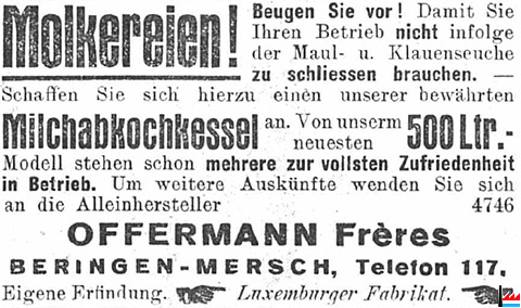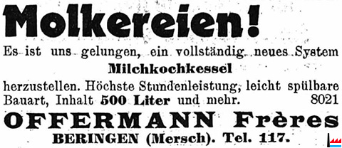 | 1939 | ![]() Molkereien! Beugen Sie vor! Damit Sie Ihren Betrieb nicht infolge von Maul- und Klauenseuche zu schliessen brauchen. Schaffen Sie sich hierzu einen unserer bewährten Milchabkochkessel an. Von unserm neuesten 500 Liter Modell stehen schon mehrere zur vollsten Zufriedenheit in Betrieb. Alleinhersteller: OFFERMANN Frères, BERINGEN-MERSCH, Telefon 117 |