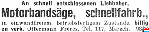 | 1946 | Prima Gartenerde, ca. 25 cbm, ev. Anlieferung, zu verkaufen. Offerten an Offermann Frères, Tel. 117 Mersch (LW: 4.9.1946) |