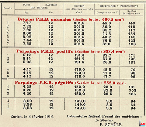 Résultats d'essais de briques creuses PKB en mortier de ciment (300 kg de ciment de Portland pour 1200 litres de sable grenu et lavé) du laboratoire fédéral d'essai de matériaux, annexé à l'Ecole ploytechnique suisse, Zurich (Collection: industrie.lu):![]() |