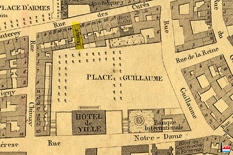 | 1862 | ![]() Passage entre - rue des Curés et Knuedler - Place Guillaume, Luxembourg (Plan de la Ville et de la Forteresse de Luxembourg, dressé par J.B. Liesch, vérificateur-chef de bureau du Cadastre - 1862) rue Chimay - rue Notre-Dame - rue Guillaume |