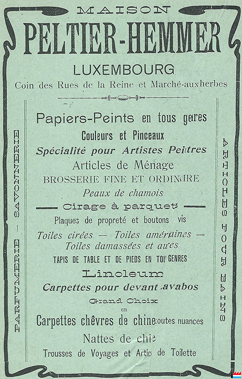 | <=1893 | Peltier H. père, peintre-décorateur, 11 rue de la Boucherie, Luxembourg Peltier - Hemmer, marchand de couleurs et papiers-peints, 18 rue du Gouvernement, Luxembourg |