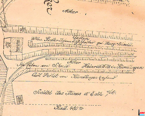 Links oben: Straße (rue des Martyrs); rechts oben: Feldweg (rue St. Joseph), Acker, Geisacker, Büreau, Witwe Weckbecker, Witwe Thomas Byrne & Cie, Carl Perlot von Rümelingen, Société des Mines d'Esch