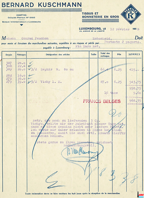 | <=1938 | ![]() Bernard Kuschmann, Luxembourg, 23 avenue de la Liberté - facture du 12.2.1938 à la Maison Conrad Peschon, Hobscheid (Collection: industrie.lu) |