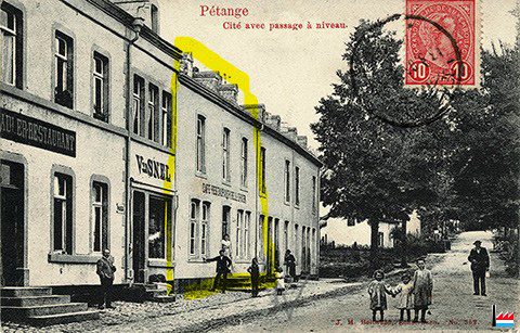 ![]() Pétange - Cité avec passage à niveau (Carte postale: Charles Bernhoeft, Luxembourg No 552; Collection: industrie.lu) Restaurant Sadler?, 112 rue de Luxembourg - Epicerie Vve Snel (spéider Epicerie Thom), 114 rue de Luxembourg - Café-Restaurant Krell-Origer, 116 rue de Luxembourg |
